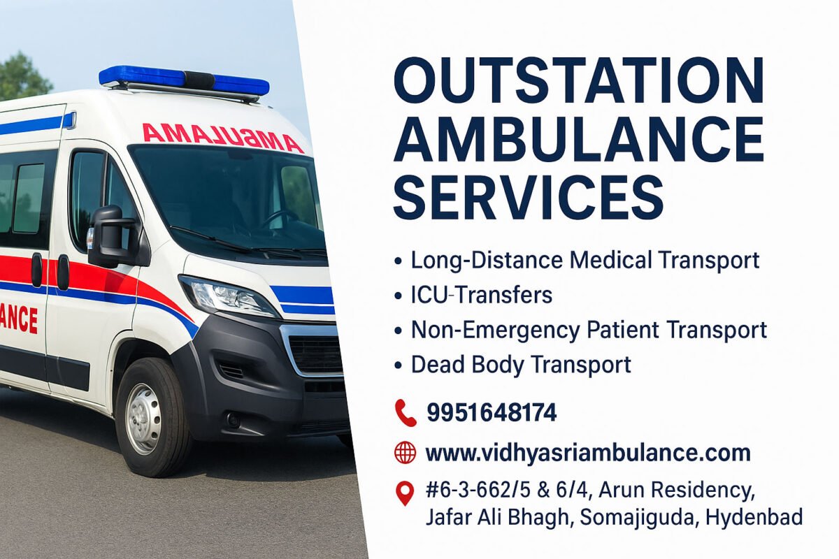 Vidhya Sri Ambulance Services is a trusted name for outstation ambulance services in Hyderabad, offering safe, reliable, and affordable medical transport across states. Whether it’s a critical ICU transfer, non-emergency patient transport, or dead body transport, we ensure professional care and comfort throughout the journey.